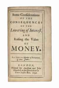 Some considerations of the consequences of the lowering of interest, and raising the value of money. In a letter to a Member of Parliament [i.e. Sir John Somers]. London, printed for Awnsham and John Churchill 1692
