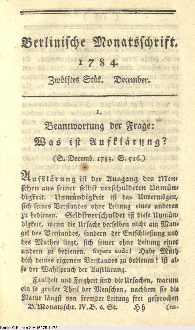 • Beantwortung der Frage: Was ist Aufklärung (1784): Kant, AA VIII