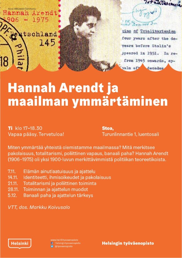 Helsingin työväenopiston yleinen luentokurssi käsittelee ajankohtaisia aiheita Hannah Arendtin ajattelun kautta.