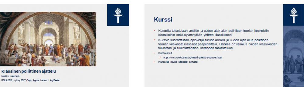 - Politiikan alkunäyttämö. Antiikin Kreikan poliittinen yhteisö ja ajattelu. Poliittinen ajattelu länsimaisessa traditiossa osa 1